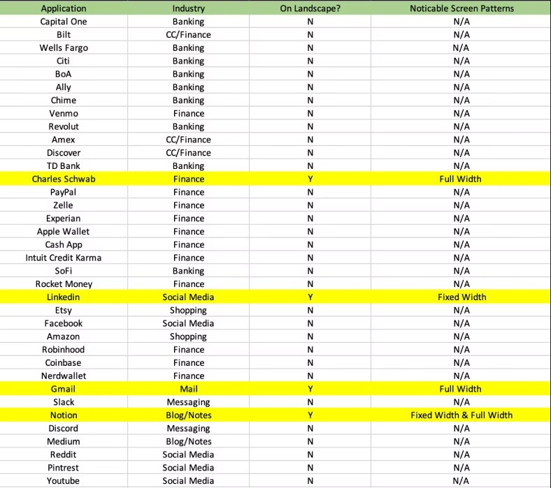 After a competitive analysis of a sample of 36 apps, only 4 supported landscape mode (11%). Among them, some utilized fixed-width layouts, while others employed full-width designs.