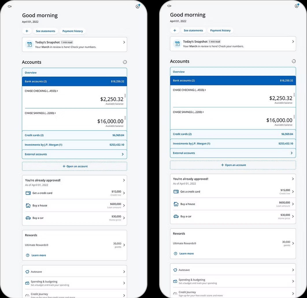 Modernized the Chase Mobile experience by implementing responsive landscape support patterns, ensuring full AA/AAA accessibility compliance for users with fixed-orientation assistive devices and tablets.